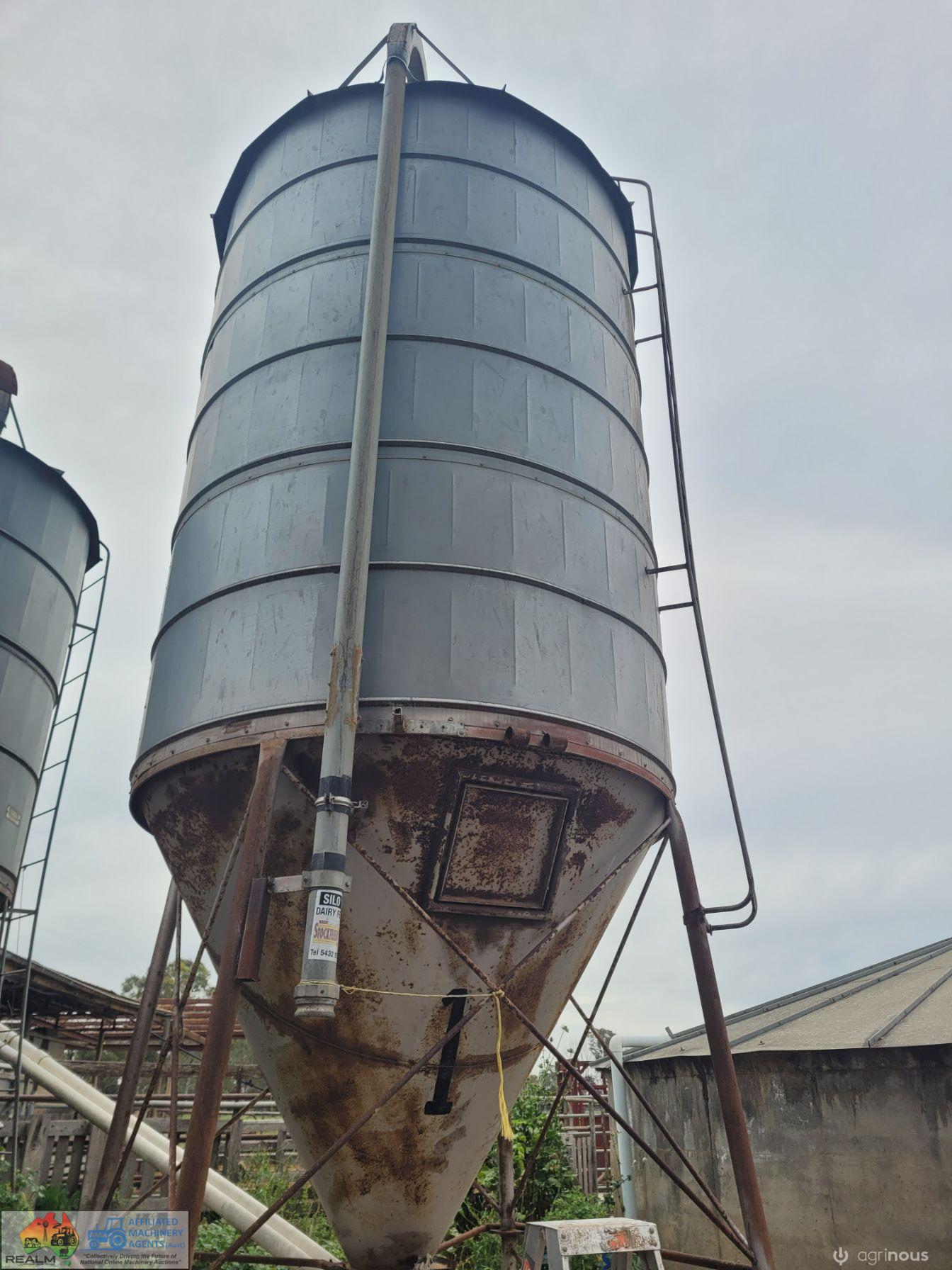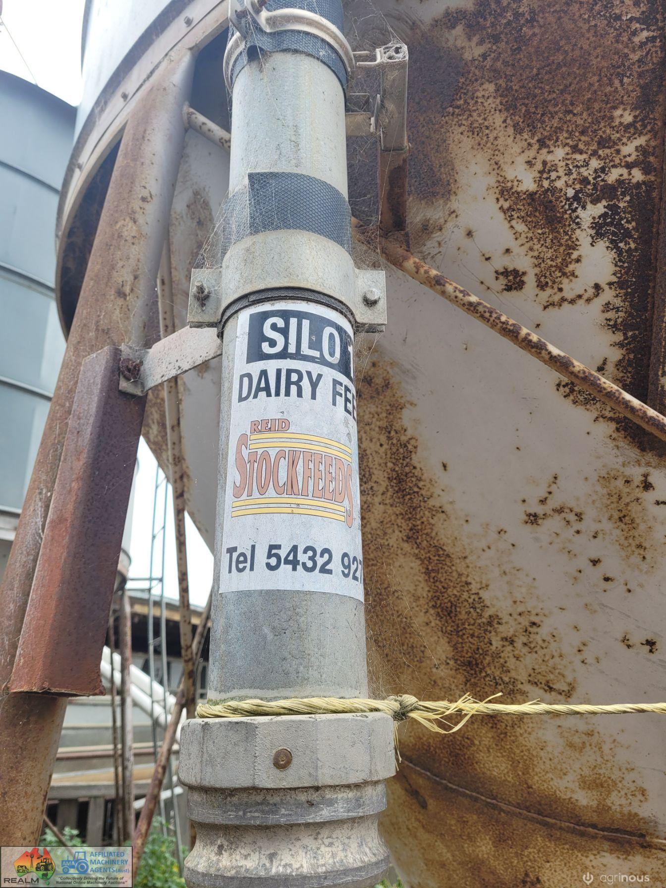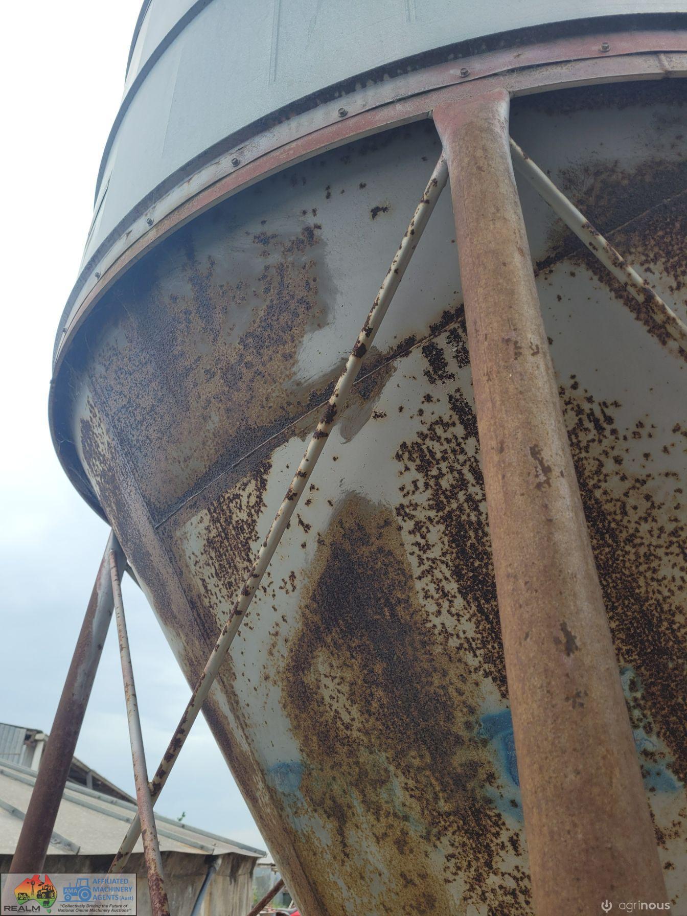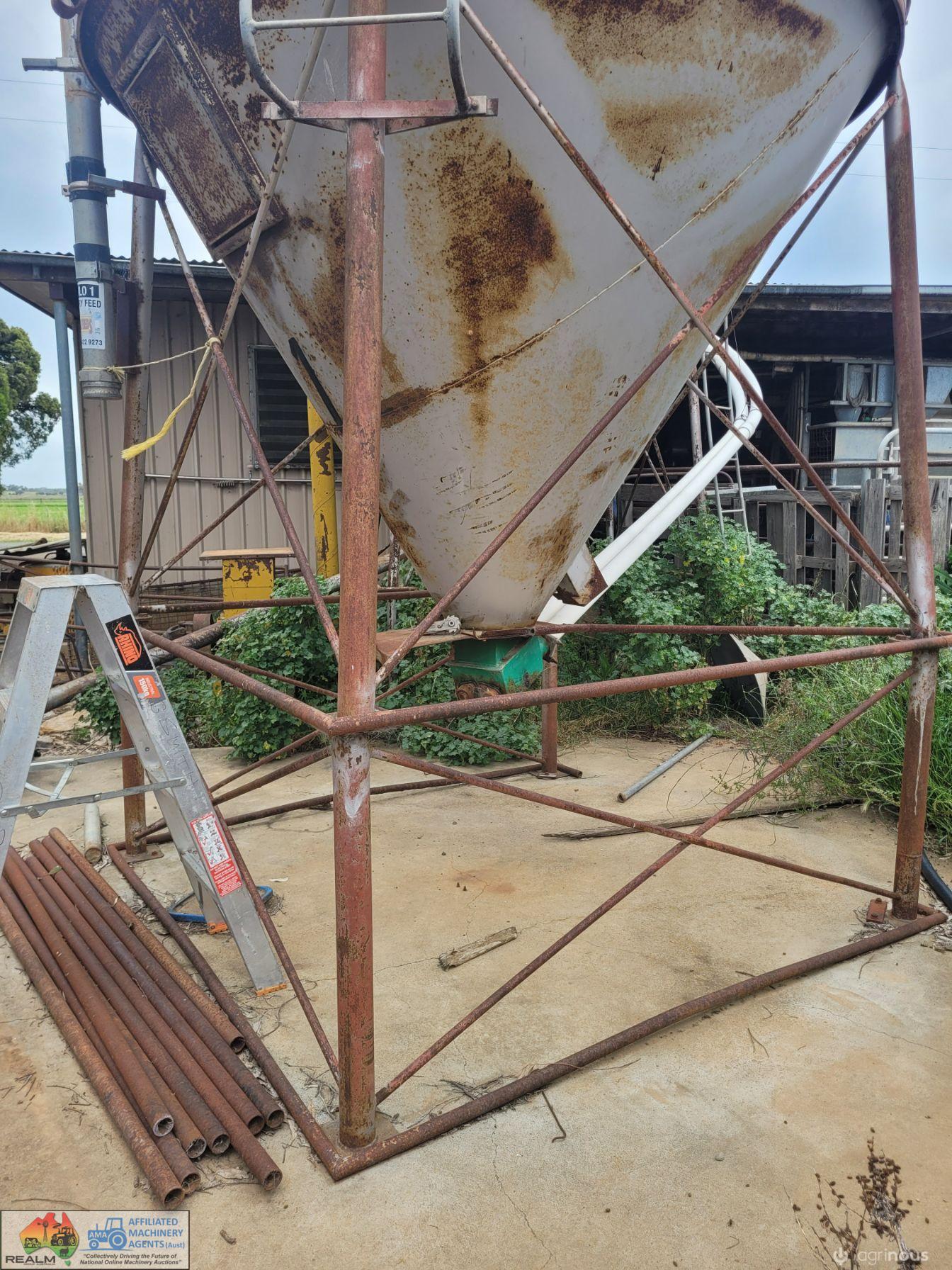 12 Ton Nelson Silo (No.1) ~ On extended base/legs ~ Blower tube ~ Pellet cone ~ No known cone damage, only surface rust. (NB: Green Flexi-auger base is not included, will be sold with dairy feed system)