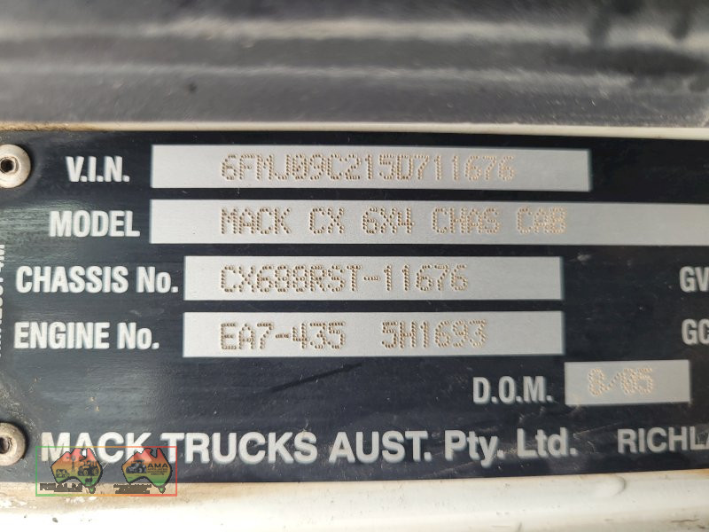 2005 Mack Vision CX-688 RST Prime Mover ~ (VIN: 6FMJ09C215D711676) ~ 435 Hp ~ 18sp Roadranger ~ Sleeper ~ Hydraulics (Suit Tipper) ~ Speedo shows 172,143.6 Kms ~ Alloy bullbar ~ Near new tyres ~ A very clean & tidy truck ~ Presents well enough to try for RWC ~ Sold as-is un-registered ~ Ideal truck ready for grain harvest season. Don't miss out Inspection recommended