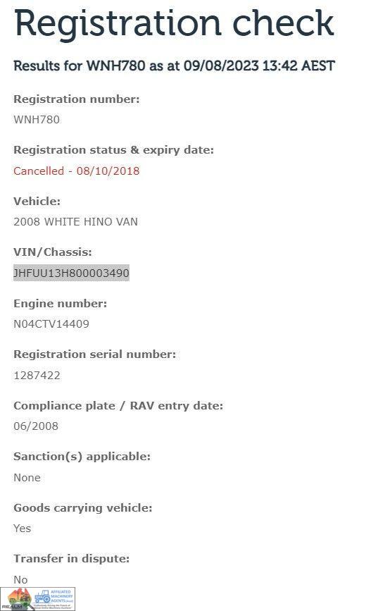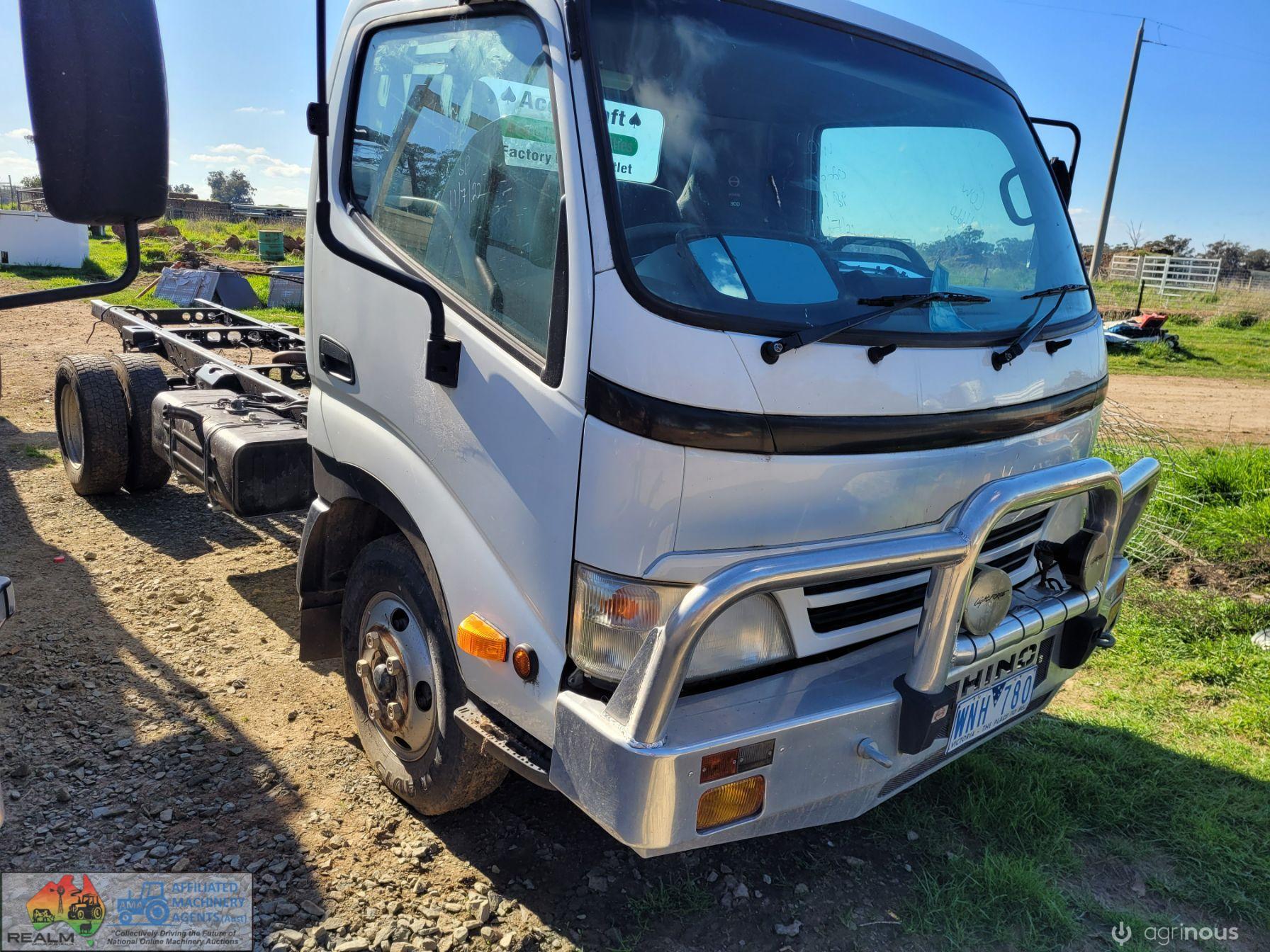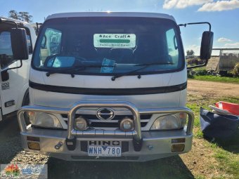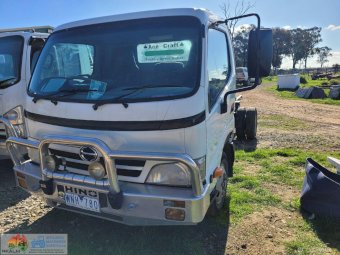 2008 Hino 300C Cab-Chassis Truck ~ Wide cab ~ Long wheel base 3.5m ~ 4cyl Turbo diesel 165Hp ~ 5 Speed manual ~ Low Kms (140,000) ~ Good alloy bull bar & driving lights ~ Near new tyres ~ One Owner from new ~ Good service history ~ Previously had 4.8m x 2.4m Alloy tray ~ Missing tail light assembly (went with tray) ~ Tidy interior, good seats (always had seat covers) ~ Starts runs & drives well, good clutch & brakes ~ New batteries, filtres & spares. ~ Previous Vic Rego, no RWC.