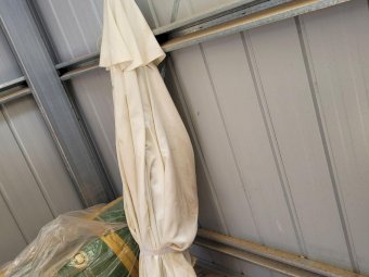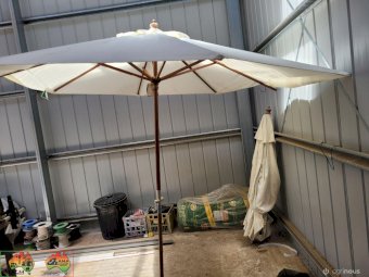 2x 2.9m Outdoor Sun Umbrellas (Near New) ~ Note: 1 umbrella is missing bottom half of timber pole