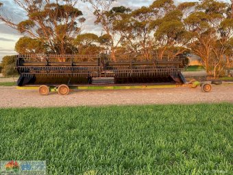 Macdon Header Front on Comb Trailer ~ 30ft 972 macdon , double drive knife, movable decks for windrowing , done 600ha on extensive pre season at local macdon dealer , comes with a box of spares. Good overall condition