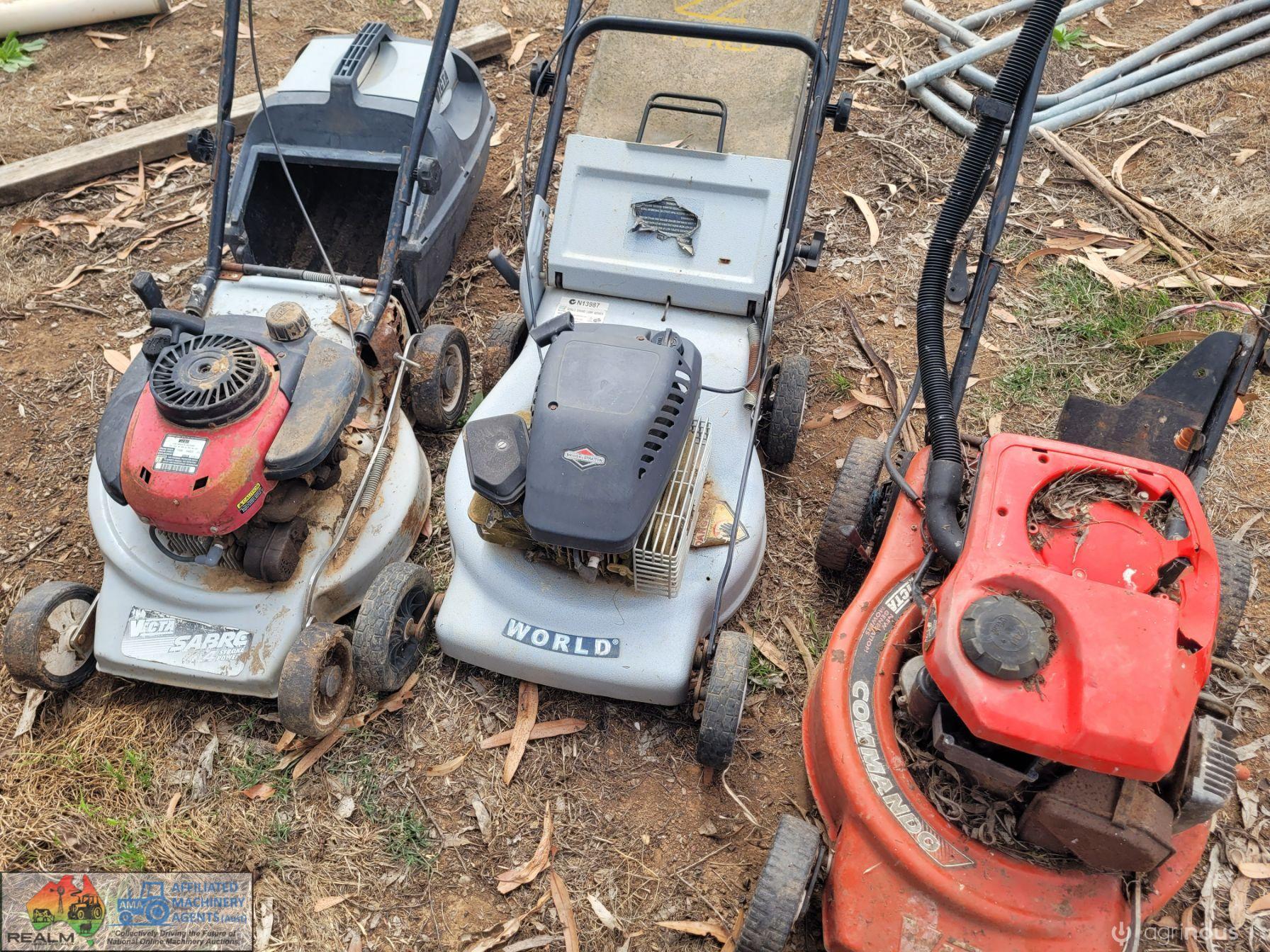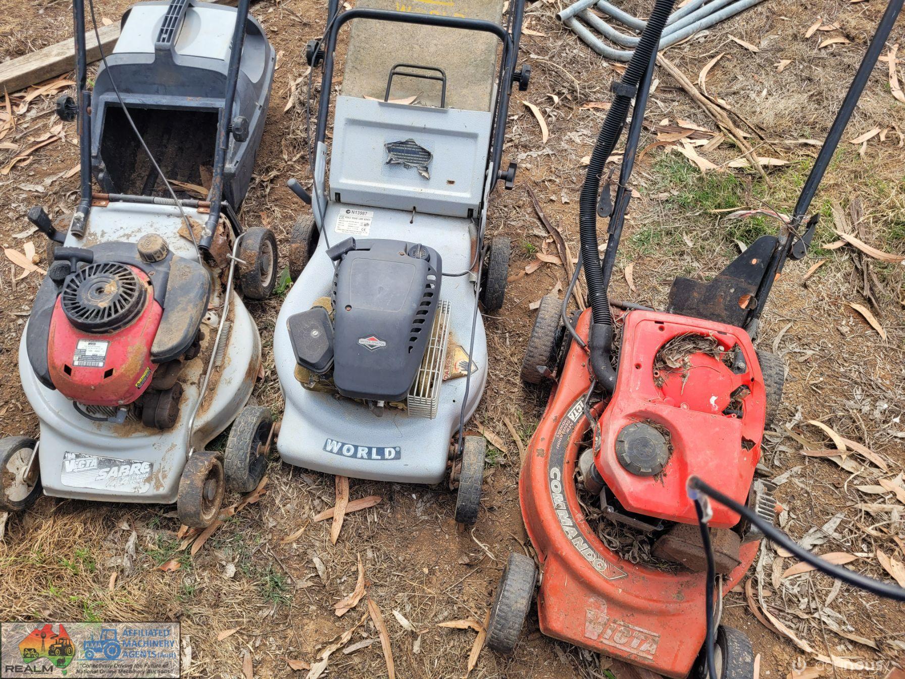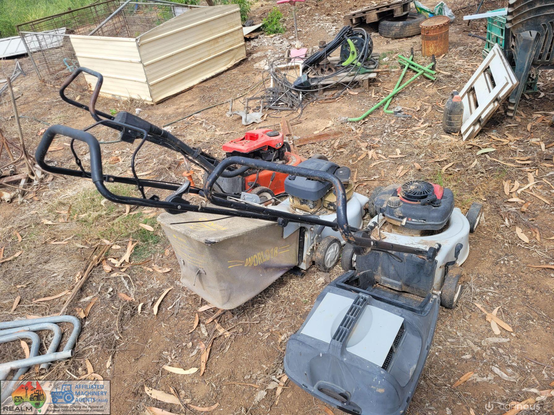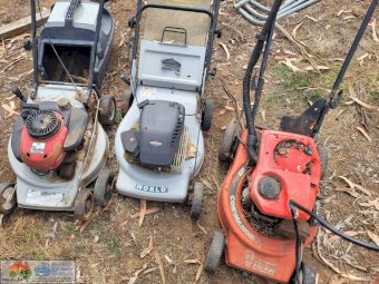 3x Lawn Mowers ~ 2x Petrol ~ 1x Battery Pak (Works, but needs new battery)