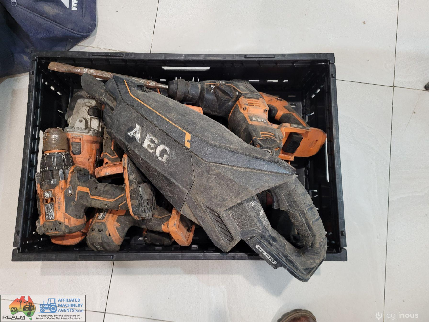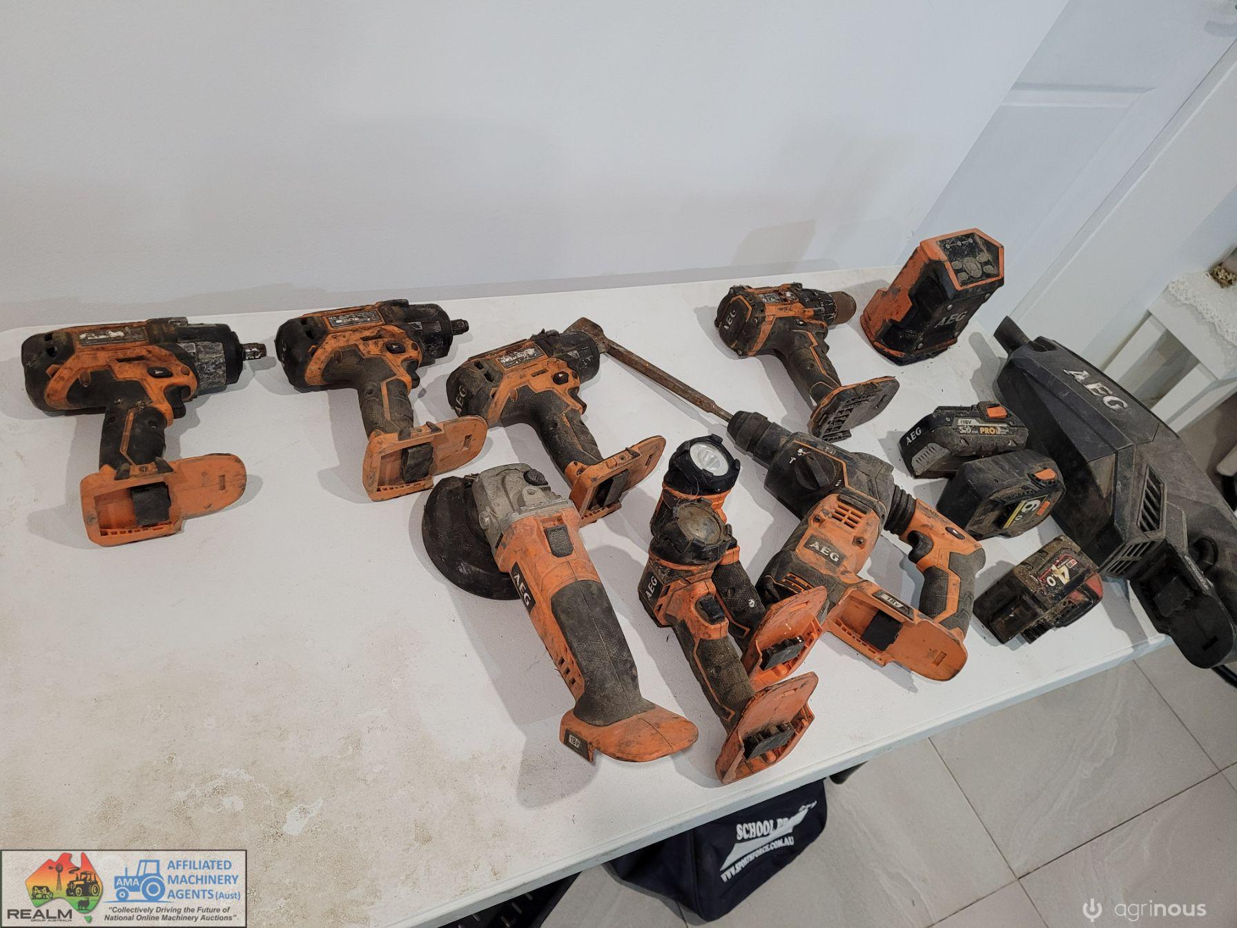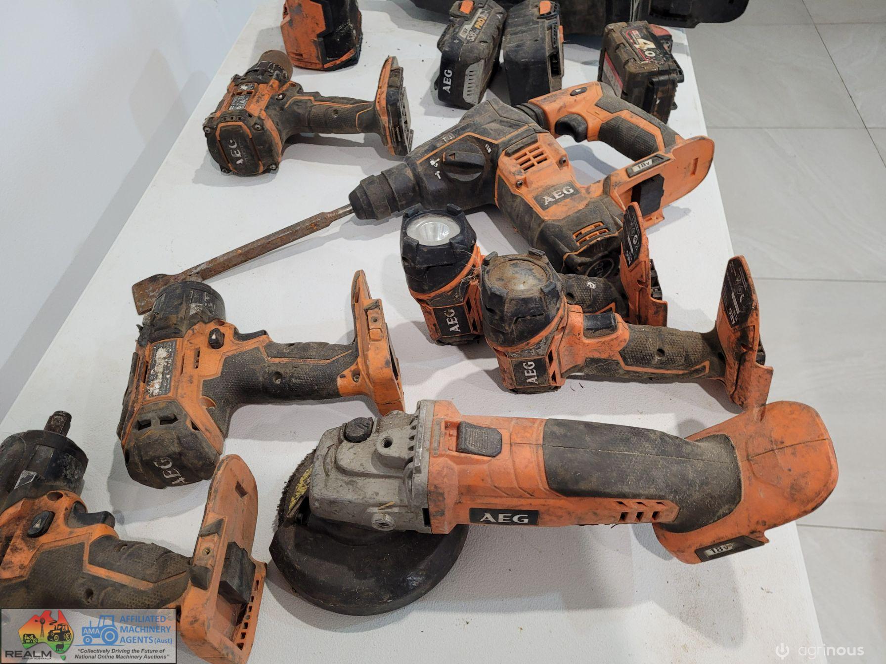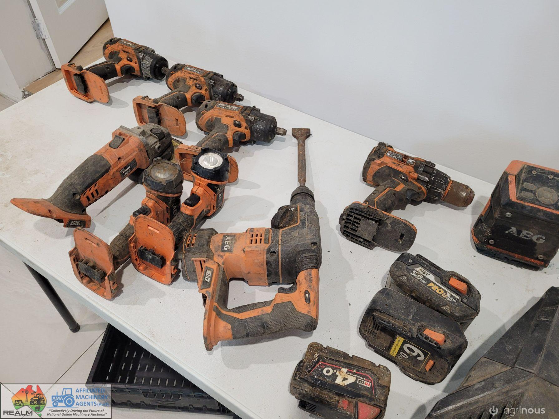 AEG 18v Cordless Tools ~ Angle grinder ~ 3x impact 1/2" socket drivers ~ Cordless drill ~ Jack hammer ~ 2x Torches ~ Speaker ~ Vacuum ~ 3x Batteries.