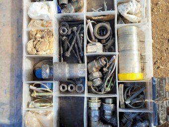 Box of Spare Parts ~ Hyd. couplings ~ New Digger auger teeth ~ Lynch pins & sundries