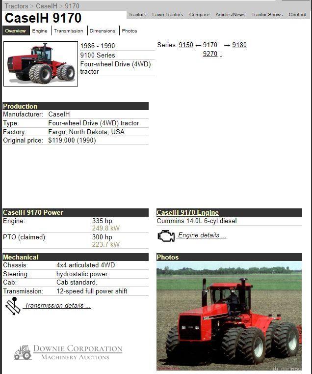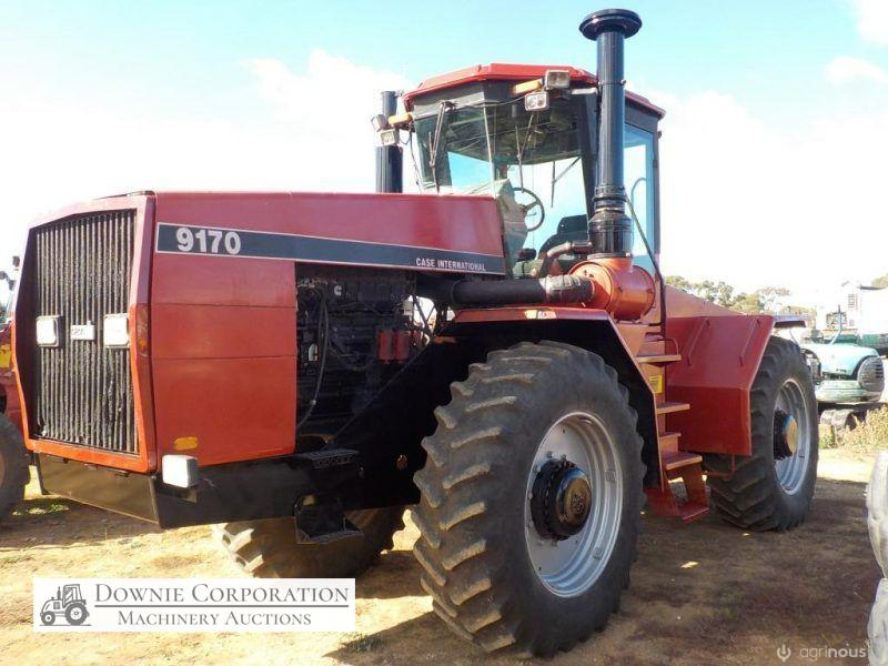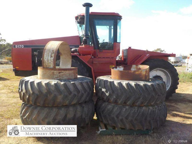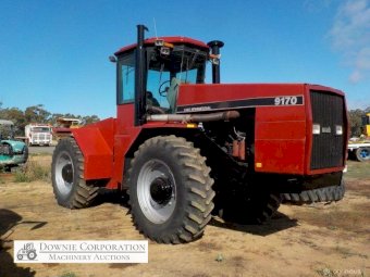 Case-IH 9170 4WD Tractor; 335HP; 12speed power shift; power steering rams have been resealed. It come with duels. Believed to be a one owner tractor. Has had a dint in front grille. Presented in original paint with minor touch ups. 9,210 hours; Tyres 40% tread no cracks; Late 80s-90 model; Starts, runs & drives. A good tidy tractor for its age. CHEAP HORSEPOWER.