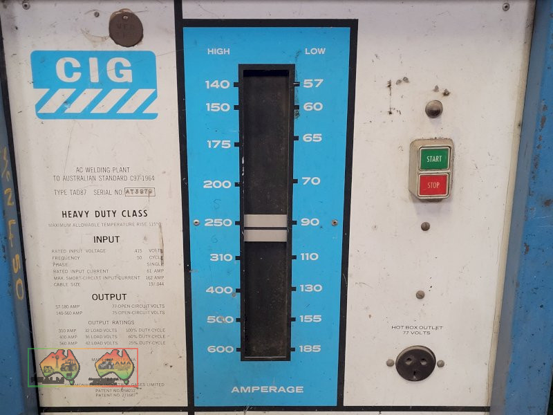 CIG Transarc HD400 Industrial Welder ~ 600 Amp ~ 2 Phase/415volt ~ Powerful welder in good working condition ~ Payment DUE within 24 Hrs of Invoice ~ Sold as-is, prior inspection recommended. ~ NB: This item will have 10% GST added. ~ A Buyers Premium of 5% (+GST) applies to all Lots. ~ If you wish to enquire further about our listings, please Contact AMA Agent: Michael on 0458 241 242 or email michaeld@amasales.com.au