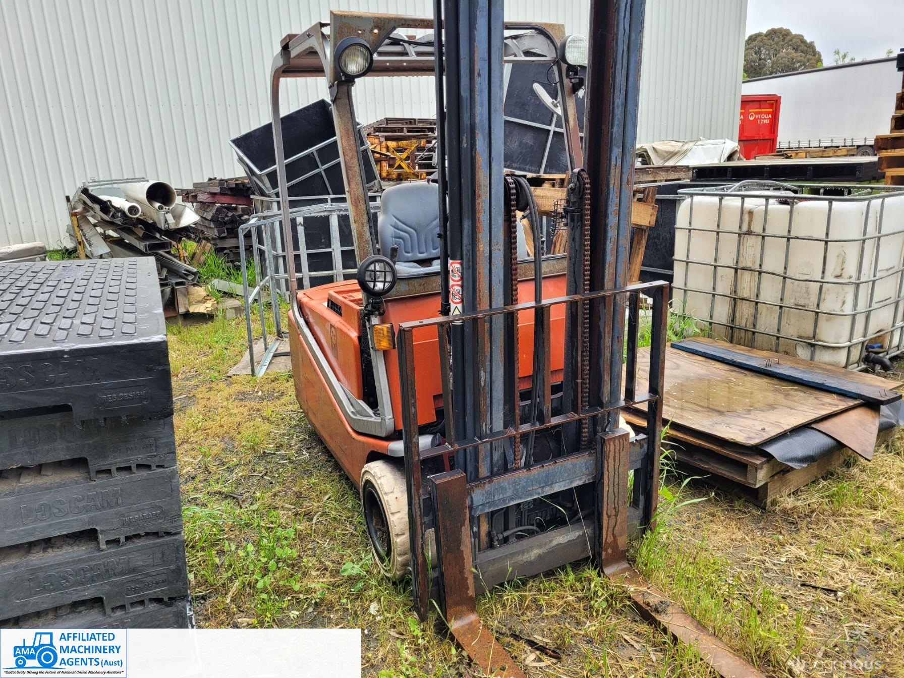 Electric Forklift (needs new batteries), in good working condition. 1.1m extra long Pallet forks. Tower lift 3.7m, Hyd. sideshift. Charger included.