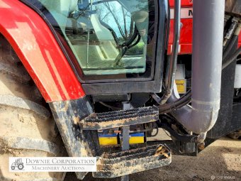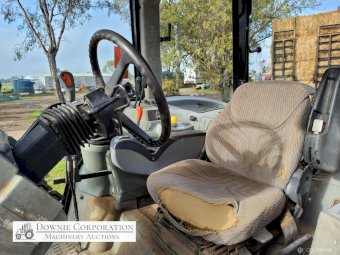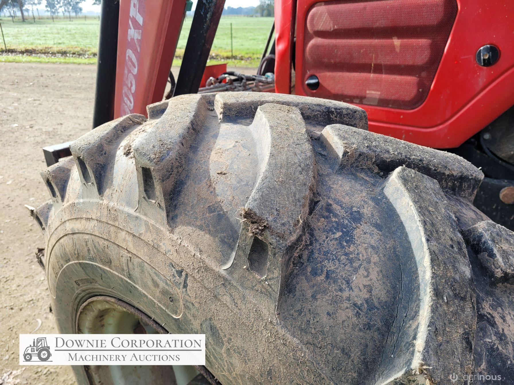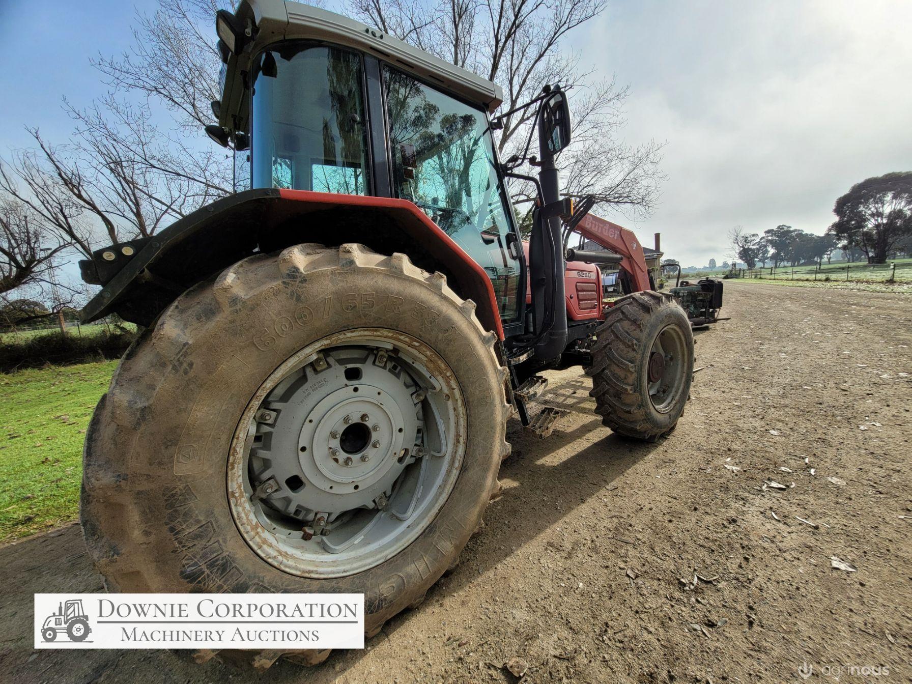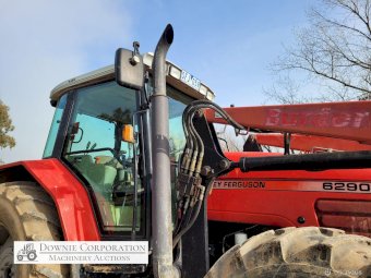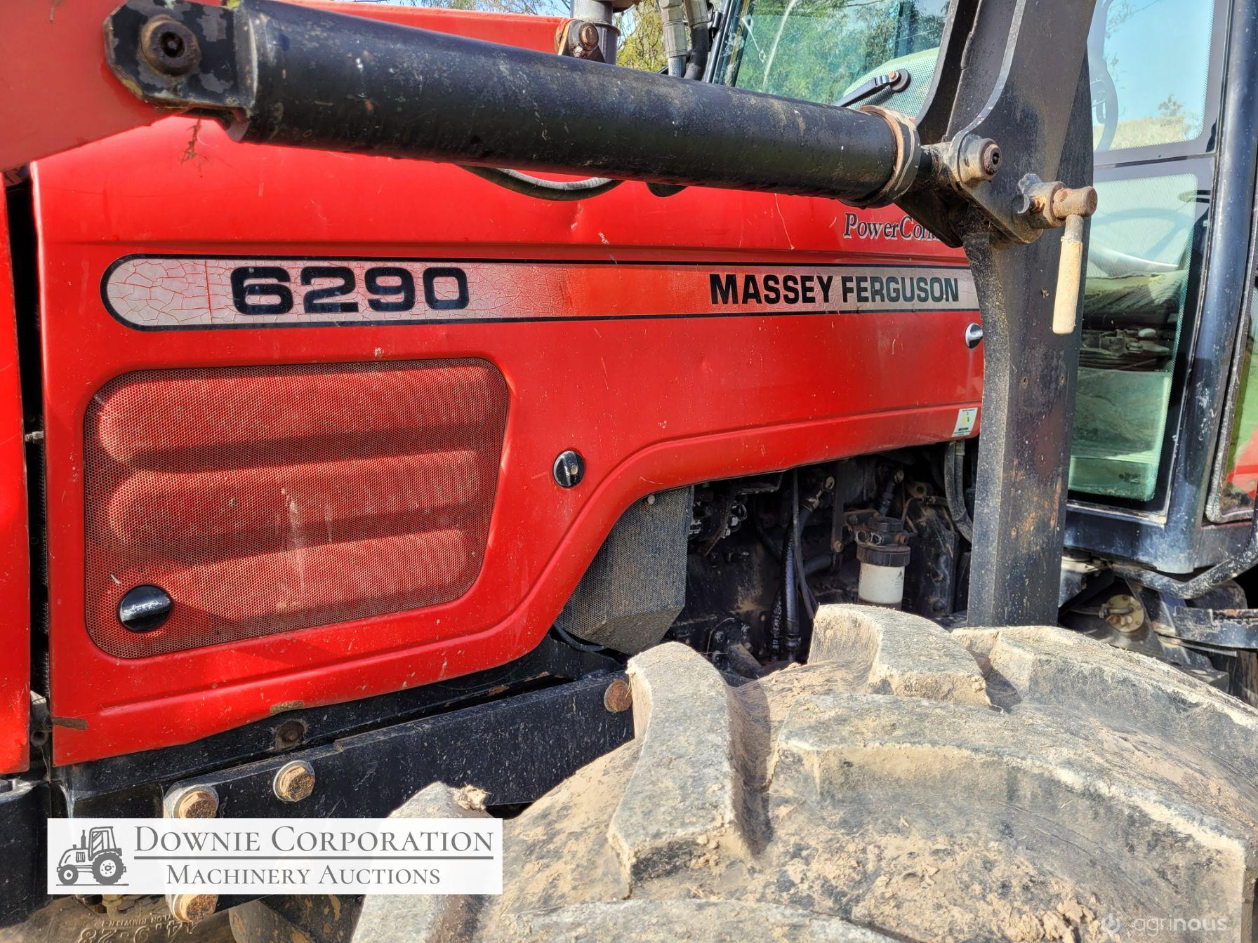 2007, MF 6290 FWA 120Hp Tractor with Burder 9050XP FEL forks only (no bucket); 6cyl diesel engine showing 9,231 Hrs. 32sp power shift transmission; A/c cab (works but may need re-gas); 3pl; Dual remotes; Tyres F=90% R=40%.