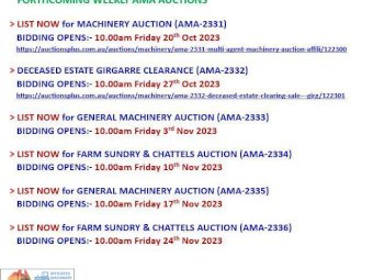 OUR NEXT AUCTIONSPLUS AUCTION (AMA-2331) ~ Opens for Bidding Friday 20th Oct @ 10am ~ Bidding concludes Monday 23rd Oct @ 8.30pm ~ Huge variety of Machinery, Equipment & Sundries ~ DON'T MISS THIS ONE :)