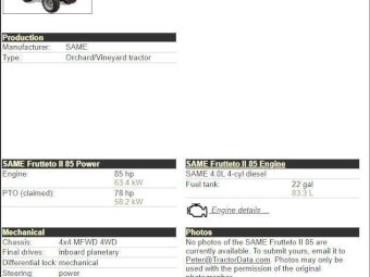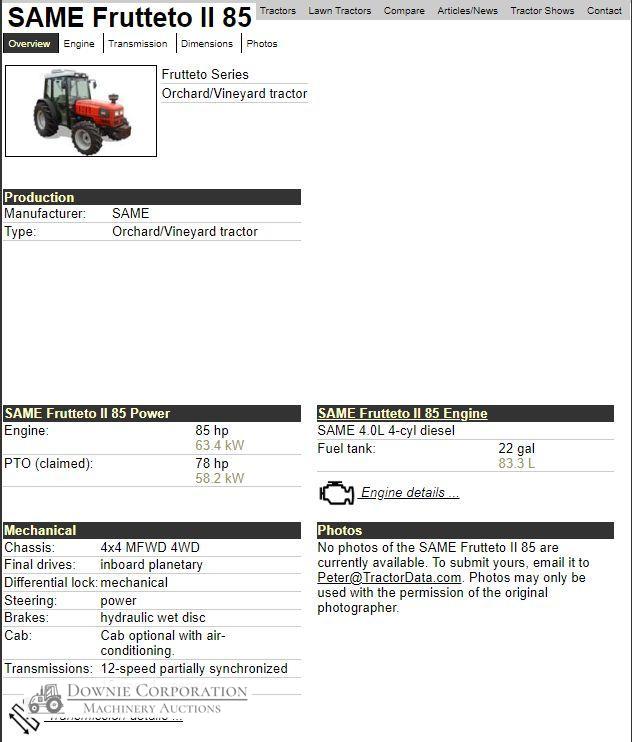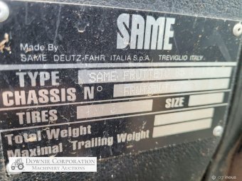 Same Frutteto-II Orchard Tractor; 85Hp; FWA; Cabin with A/c & radio; 5,146 Hrs; Tyres R=60% F=5%. Just recently serviced. Starts, runs & drives well (see video)