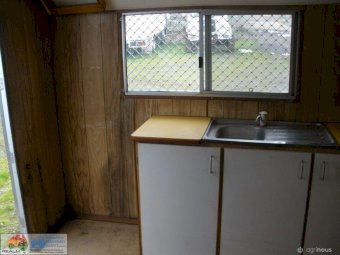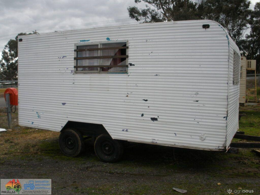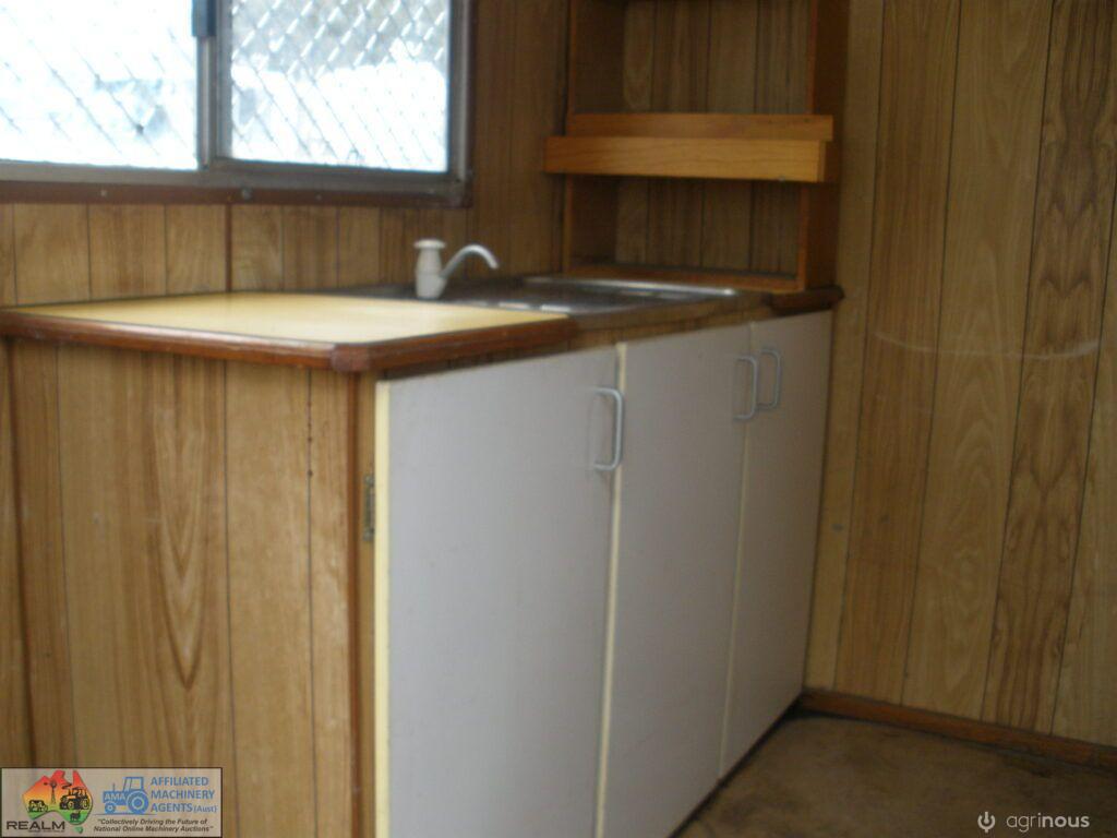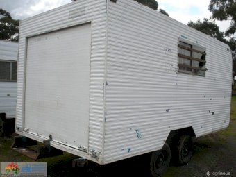 Tandem Axle Site Van ~ No power or lights ~ has table, bench seating & kitchen cabinets with sink ~ Tool storage at rear via external roller door ~ good tyres ~ ring-pull hitch ~ No vin or compliance plate ~ Body is 2.44m wide 4.8m long ~ Tool area is 1.45m internal ~ Total length is 6.7m long including draw bar and rear step ~ No rear lights ~ May have some broken window glass ~ Ideal mobile lunch room & toolbox for casual workers/pickers.